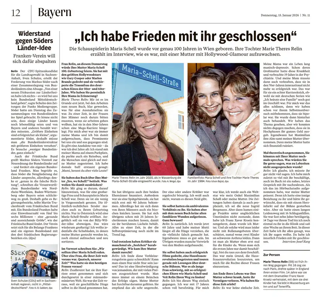 - Rosenheim24.de (05.12.2025): Tochter Marie Theres Relin erzählt das Leben der legendären Maria Schell