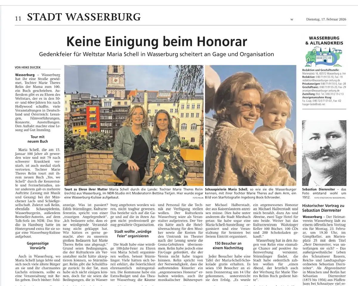 - Wasserburger Zeitung (17.02.2026): „Warum Weltstar Maria Schell in Wasserburg nicht gefeiert wird“